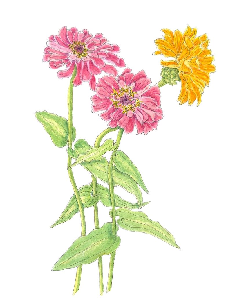 Zinnias Pen & Watercolor Original signed 11x14 on 140 lb Arches hot press with white mat