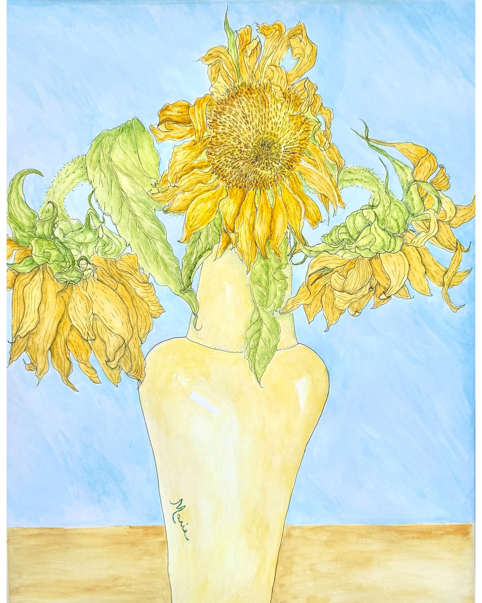 Zinnias Pen & Watercolor Print 11x14 on Hahnemuhle paper with white mat